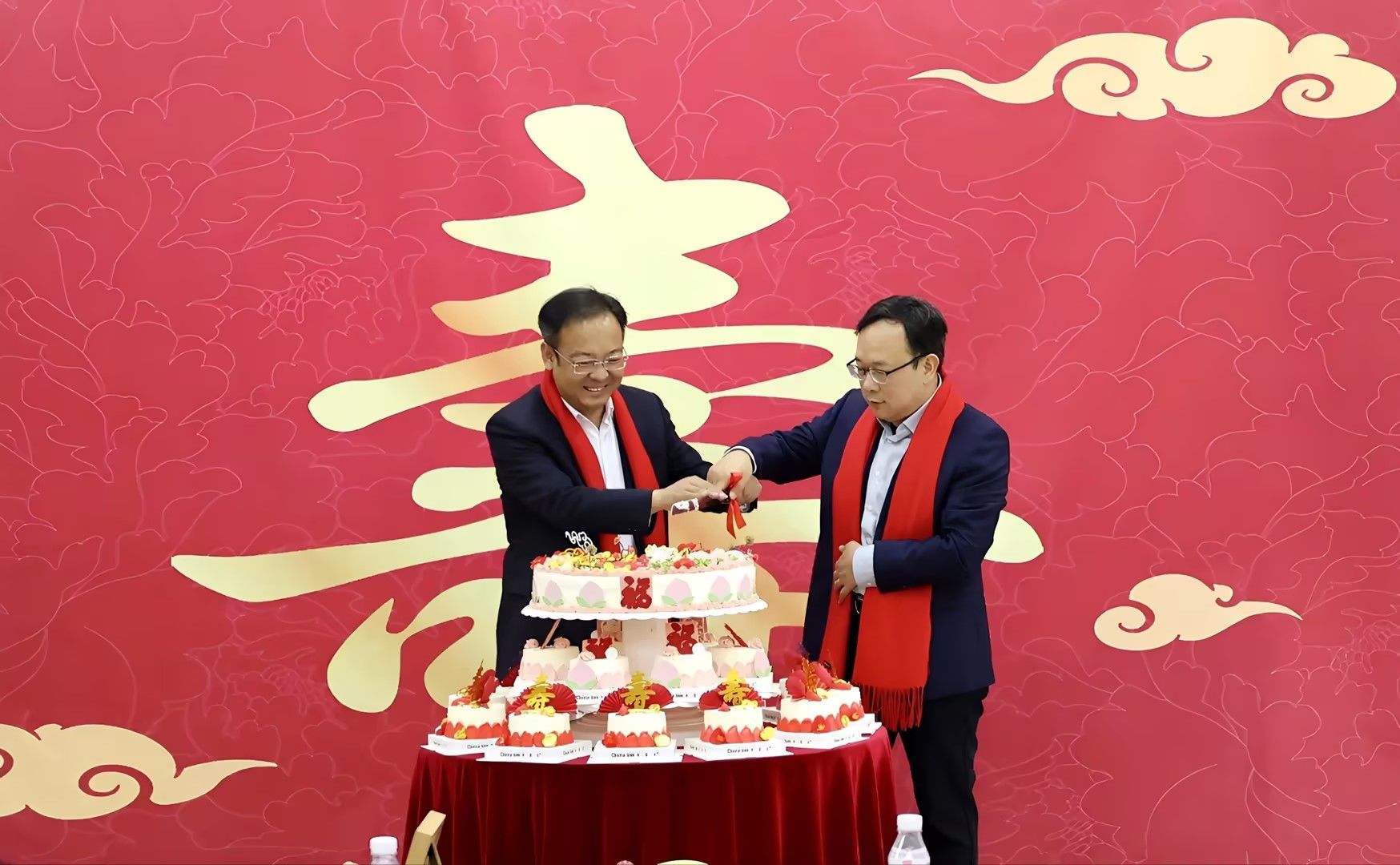 随后,一个精美的生日蛋糕被缓缓推出,将现场气氛推向高潮。霍庆生与刘坚共同执刀切下象征团圆与幸福的蛋糕。这一刻,甜美的蛋糕香气与浓浓的祝福之情交融,寓意着老同志们的生活甜蜜美满、幸福安康。