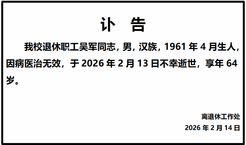 吴军同志逝世讣告